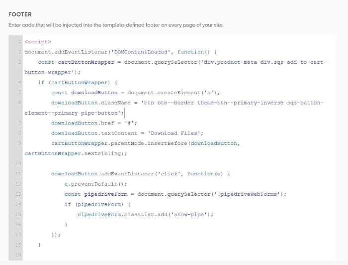 #1. First, edit Product Additional Info > Add a Code Block > Enter Pipedrive form embed code. Something like this.